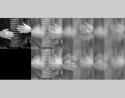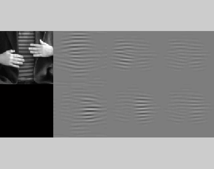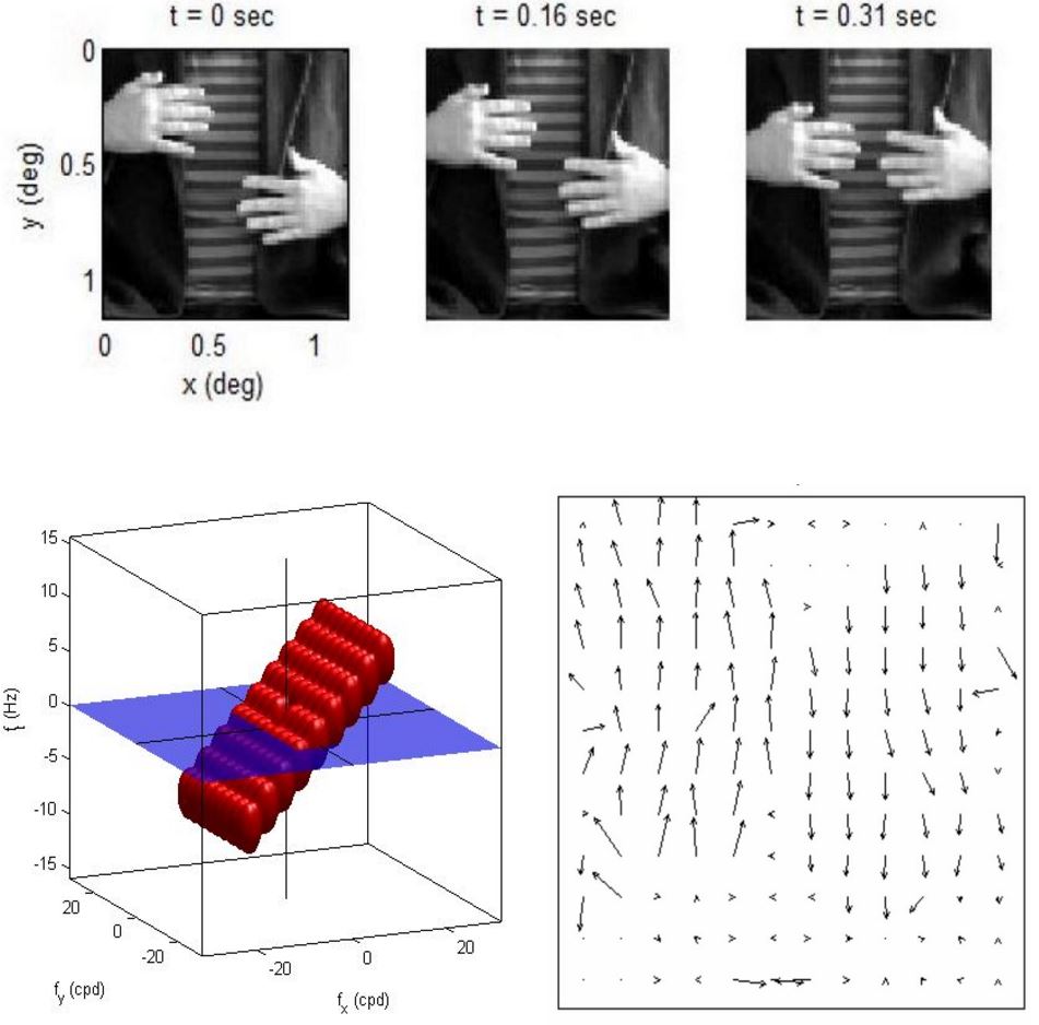 Empirical motion model at work: Waving hands sequence recorded at my lab (just a remake of the original movie from Watson & Ahumada), linear filter model of MT neurons as an aggregate of spatio-temporal wavelet-like filters (bottom left) tuned to certain speed for optical flow computation (example at bottom right for a later frame). Note that our remake improved the original by including a striped costume for Fourier-obsessed freaks!