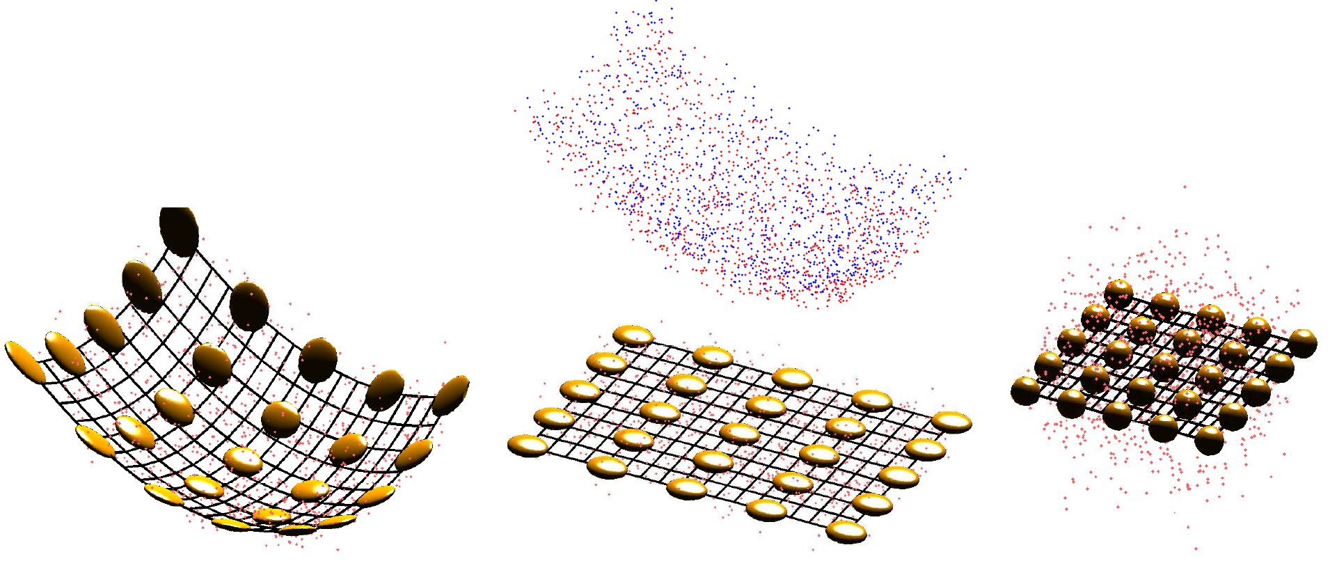 Illustrative learning technique: data induced metric and identified features using nonlinear feature extraction (in this case, the Principal Polynomial Analysis, PPA). The scatter plot (at the top) shows the training set, the 2nd row shows the features (curves in black) and the discrimination ellipsoids (in yellow) in different representation domains: the original domain (left), the data-unfolded domain after PPA (center), and the whitened PPA domain (right). Principal Polynomial Analysis looks for the intrinsic curvilinear coordinates generalizing the linear directions of PCA (principal polynomials instead of eigen directions). Similarly to Mahalanobis distance when using PCA, the Jacobian of PPA can be used to define data dependent measures. Similarly to what is done in (linear) Independent Component Analysis, the Jacobian of PPA can be used to identify intrinsic features in the input domain. As opposed to the linear counterparts, metric and features are local. Different sets of local features (local basis vectors) in the input domain (3rd row) or in the PPA-transformed domain (4th row) can be obtained from the Jacobian or the jacobian-related metric matrix. See available CODE for this and other feature extraction techniques here.