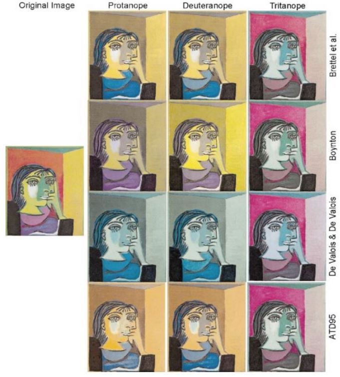 See how it feels to be color blind!: We proposed a way to simulate the perception of color blinds (here with Picasso's Dora Maar). As you see, dichromats are not color blind at all: they simply see different colors. Moreover, this simulation can be used to discriminate between color theories just by asking your dichromat friend which image is more similar to him.