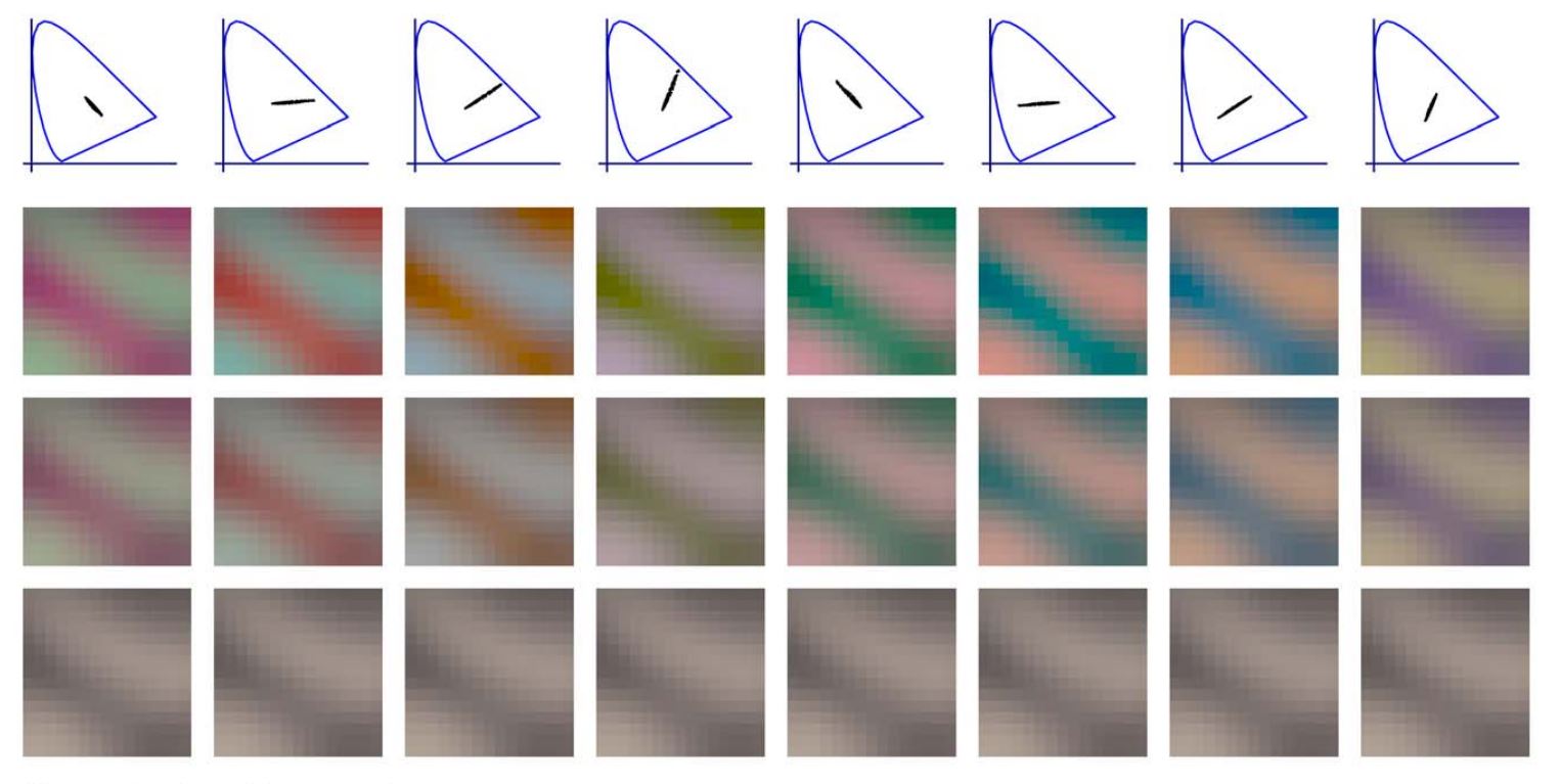 This category refers to the proposition of organization laws of sensory systems that explain the empirical phenomena. These principles show that neural function has been adapted to (or is determined by) the statistics of visual stimuli. In this regard, (i) we worked on the derivation of the linear properties of the sensors, and we found that their spatio-chromatic sensitivity, the way the receptive fields change, and their phase properties, come from optimal solutions to the adaptation problem under noise constraints and manifold matching [PLoS-ONE14, IEEE-TGRS13], from statistical independence requirements [LNCS11, NeuroImag.Meeting11], and from optimal estimation of object reflectance [IEEE TGRS14]. (ii) We also worked on the derivation of the non-linear behavior for a variety of visual sensors (chromatic, texture, and motion sensors). We found that in all cases the nonlinearities are related to optimal information transmission (entropy maximization) and/or to error minimization in noisy systems (optimal vector quantization). We studied this relation in the classical statistics-to-perception direction (deriving the nonlinearity from the regularities in the scene) [Network06, Neur.Comp.12, Front.Neurosci.15], as well as in the (more novel) perception-to-statistics direction, i.e. by looking at the statistical effect of perceptually motivated nonlinearities [J.Opt.95, Im.Vis.Comp.00, LNCS00, Patt.Recog.03, Neur.Comp.10, LNCS10, NeuroImag.Meeting11].
